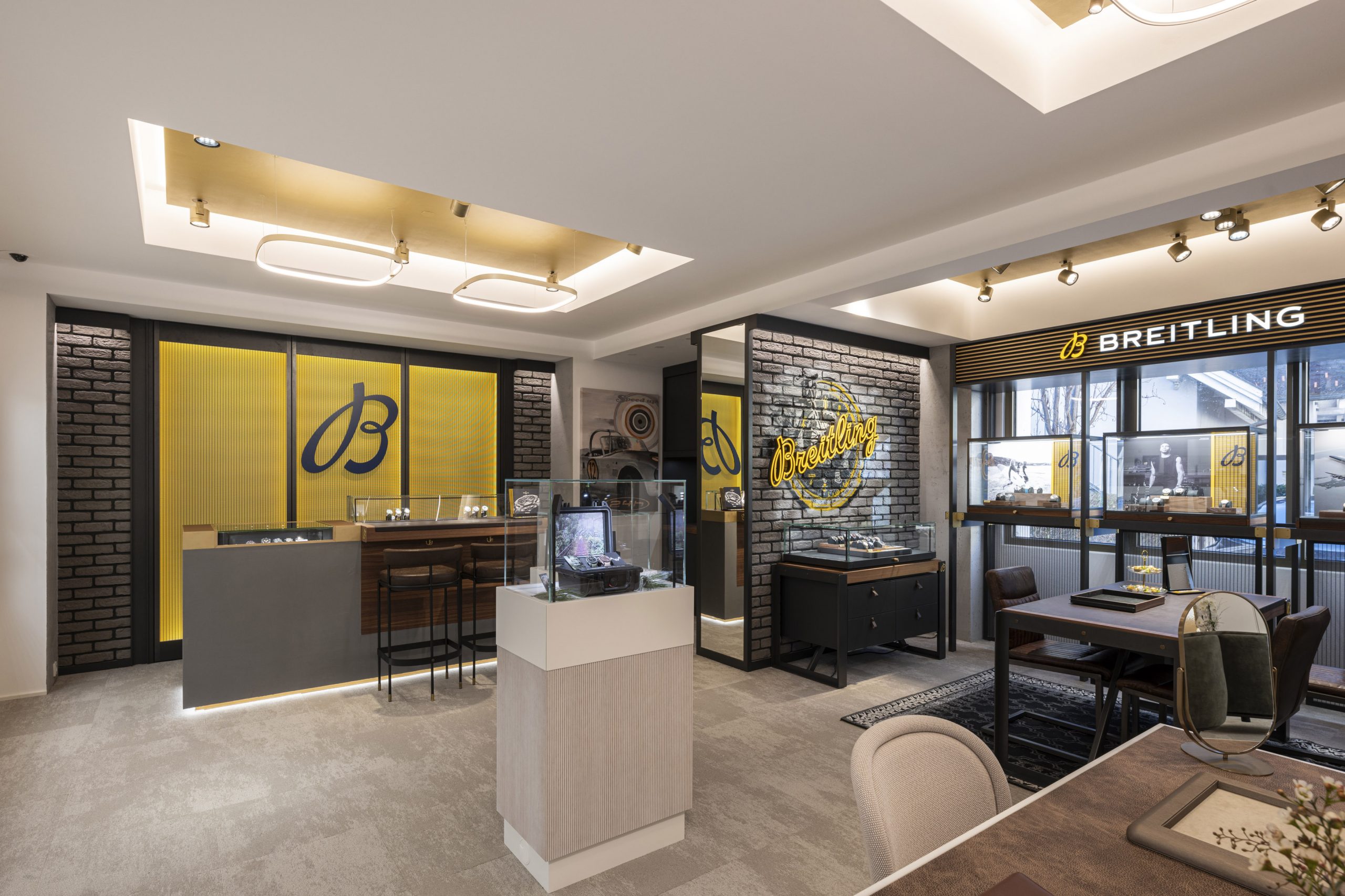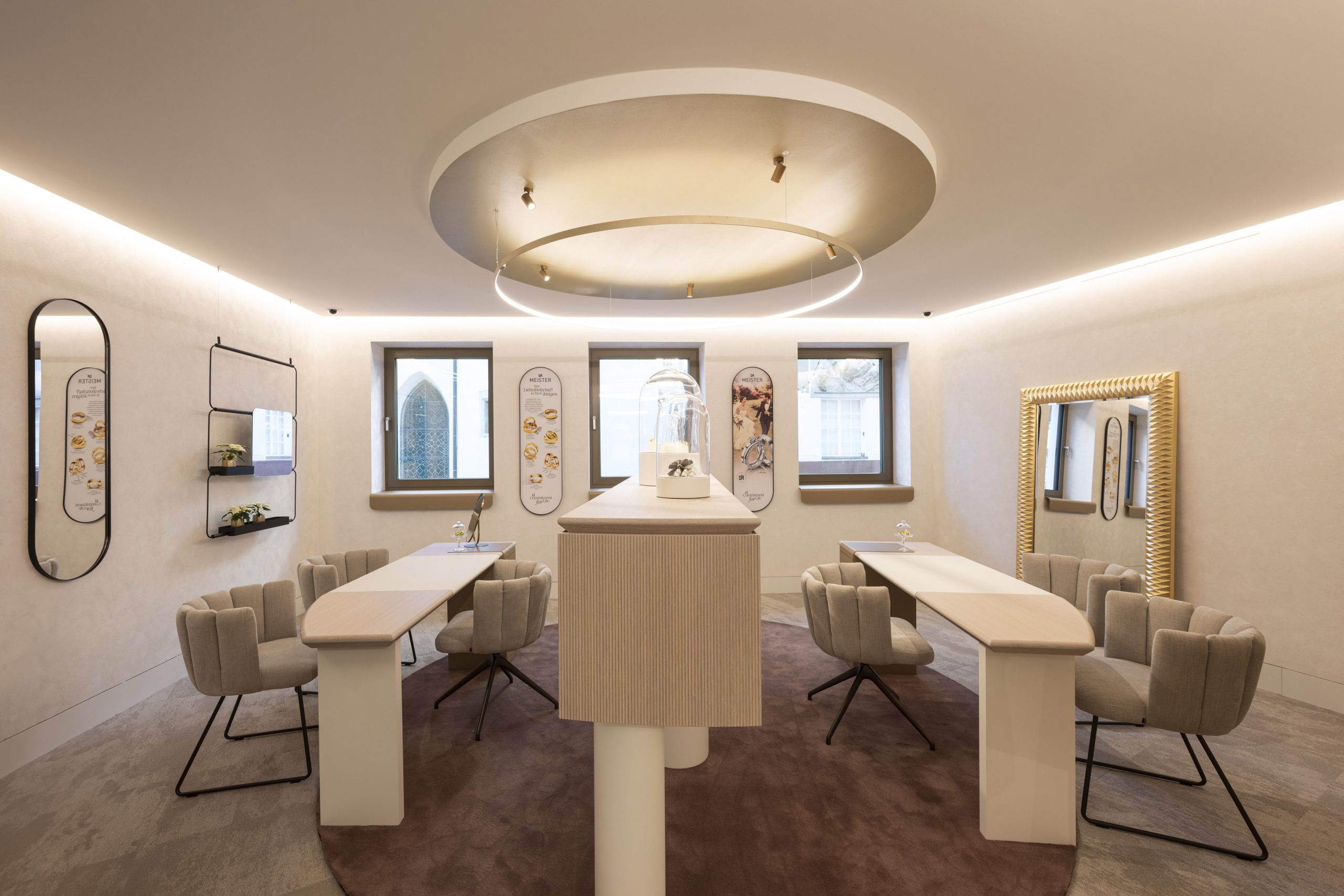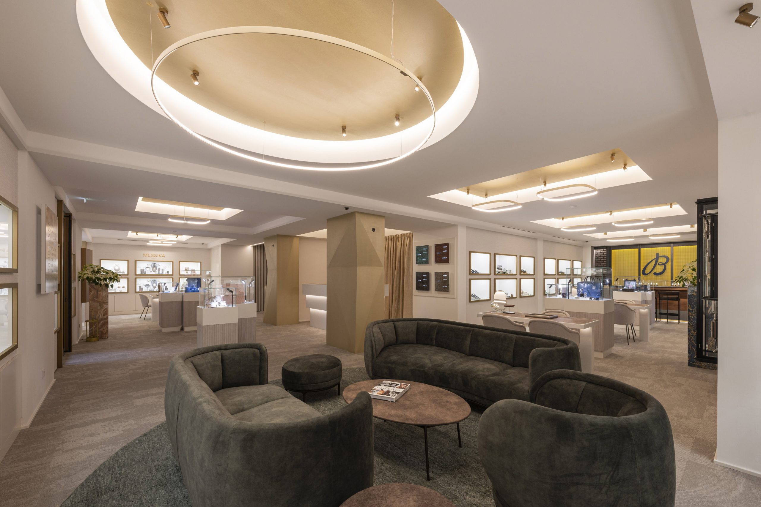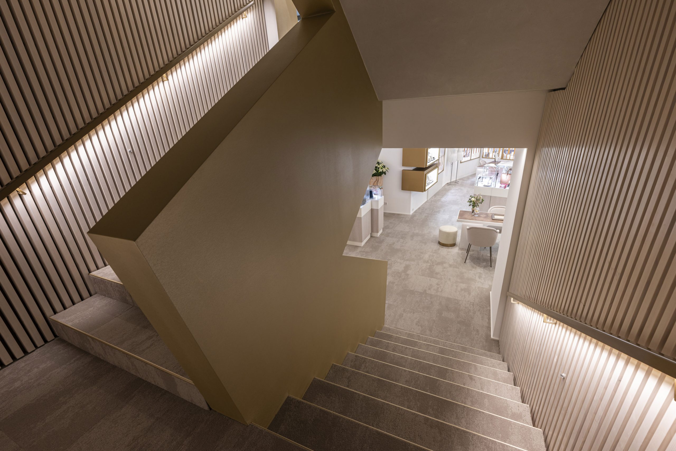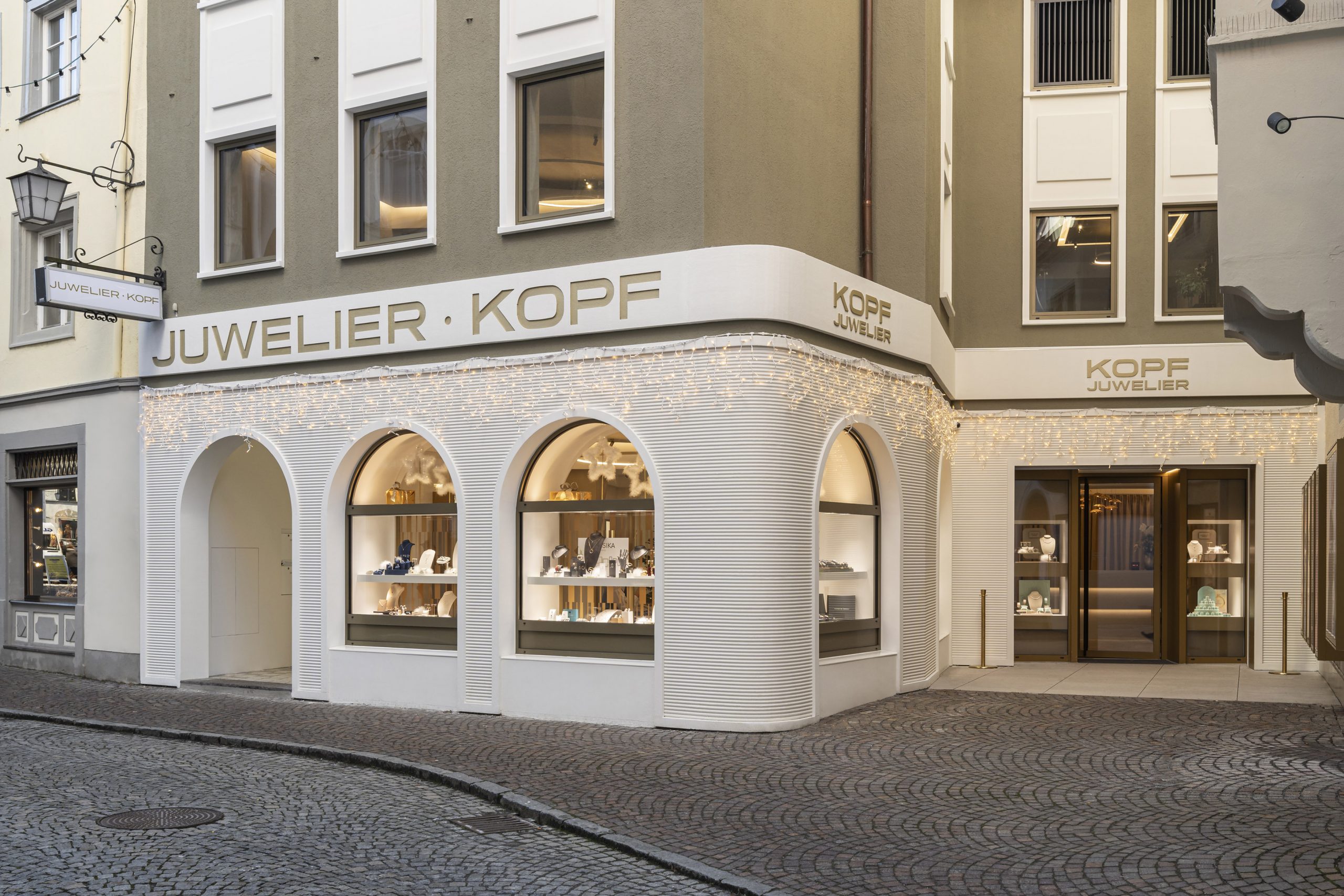 Im Herbst 2023 eröffnete das Vorarlberger Familienunternehmen Kopf einen neuen Standort in Feldkirch. Es sollte ein völlig anderes Juweliergeschäft entstehen, mit deutlich mehr Platz – eines, das zum Verweilen einlädt und voller Geheimisse ist, die es zu entdecken gilt. Wir haben versucht, Erlebniswelten für unsere Kunden zu schaffen: Feine Armbanduhren, Diamanten, Trauringe oder auch die Bar sollen ungezwungen erlebt werden. Auf 3 Ebenen entstand ein Juweliergeschäft, das regional wie auch überregional seines gleichen sucht. Eine klare Designsprache und unkonventionelle Ideen sollen den Kunden immer wieder auf’s Neue begeistern. Um die Fläche zu erhalten, wurden zwei alte Stadthäuser sehr aufwendig zu einem großen Ganzen verbunden – tragende Wände wurden entfernt, die bestehenden Gebäude komplett ausgehöhlt und neu gestaltet, auch das Fassadenkonzept ist völlig neu. Die Firmenfarbe kommt immer wieder im Gebäude vor, die Winkel der Säulen sollen an die Facetten eines Edelsteins erinnern.