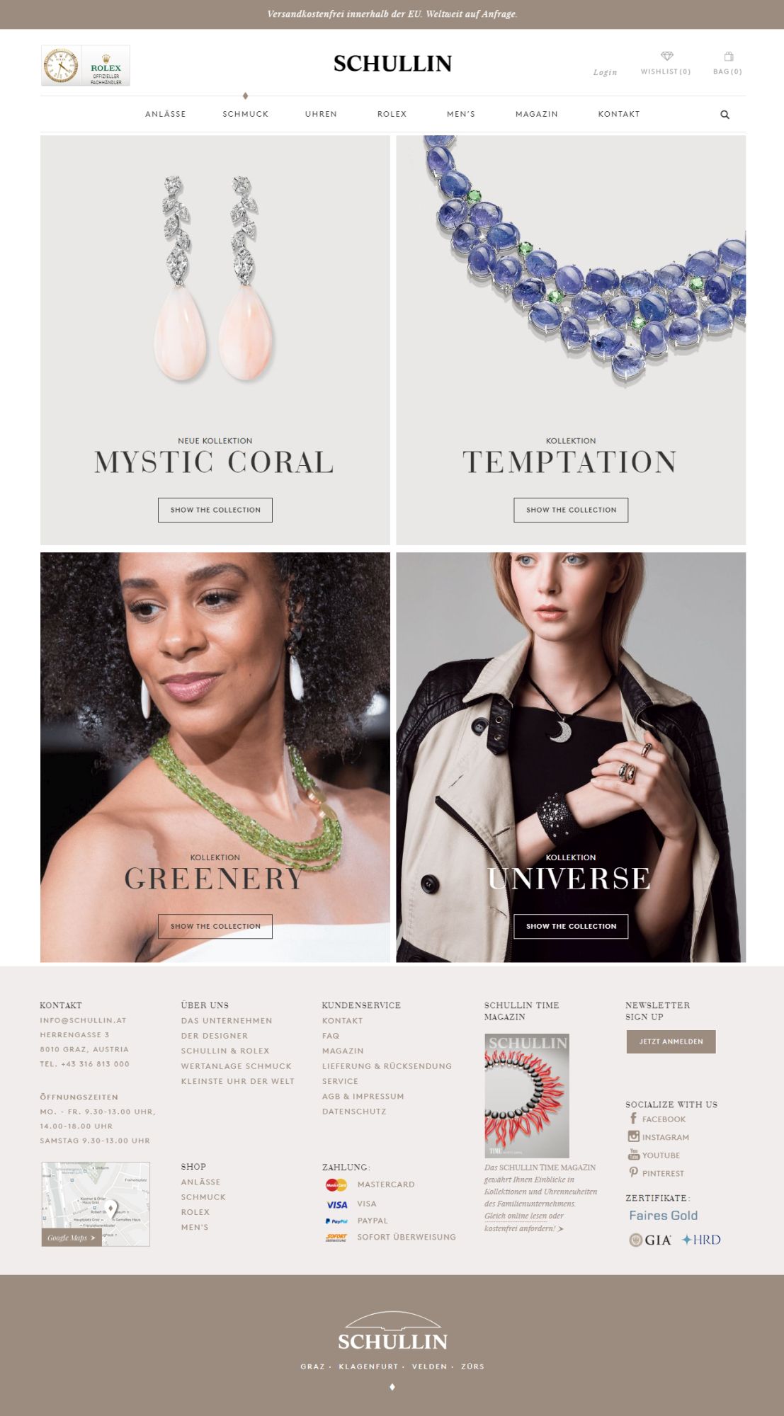 Das Erscheinungsbild der Homepage und Teaser wird im Verlauf des Jahres im Einklang mit den Auslagen der stationären Geschäfte und den Print-Aussendungen (Weihnachten, Valentinstag, Muttertag…) adaptiert. Das Design des Onlineshops unterstreicht die zeitlose Eleganz der angebotenen Schmuckstücke und transportiert den Luxus, der auch im stationären Geschäft geboten wird. Ganz harmonisch fügen sich Schmuckstücke, Luxusuhren, Blogbeiträge, Unternehmens-Insights und Produktinformationen zu einem exklusiven Online-Ensemble, das zugleich Orientierung und Inspiration bietet und natürlich Shopping forciert, zusammen. Der Webshop ist übersichtlich und gibt dem Schmuck dennoch den Platz, den er braucht, um zu wirken – auch am Bildschirm. Texte, die die Geschichten hinter den Produkten erzählen und den Zeitgeist des Schmuckdesigns aufgreifen, machen die Welt von Schullin persönlich und greifbar, sie zeugen von Kompetenz und Know-how. Trotz hoher Funktionalität bleibt der Onlineshop leicht zu bedienen. Damit die Schmuckstücke und Uhren auf allen Devices überzeugen können, ist das Webshop-Design natürlich responsive.